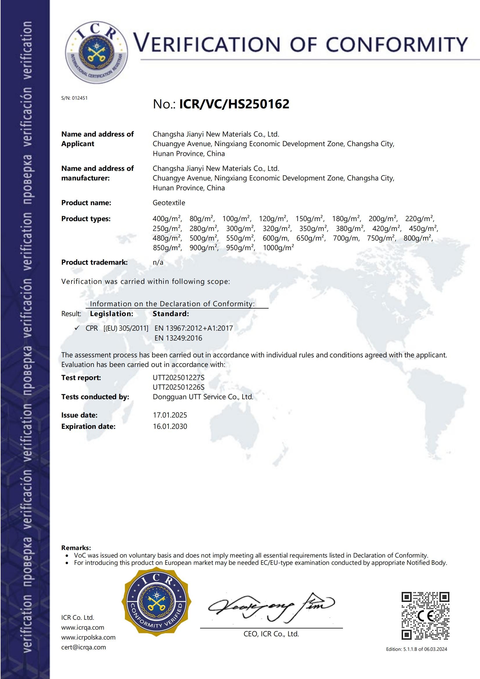 Jianyijest największym producentem Long Firber Geotextile w Hunanie, jesteśmy jednym z członków HNWPA.